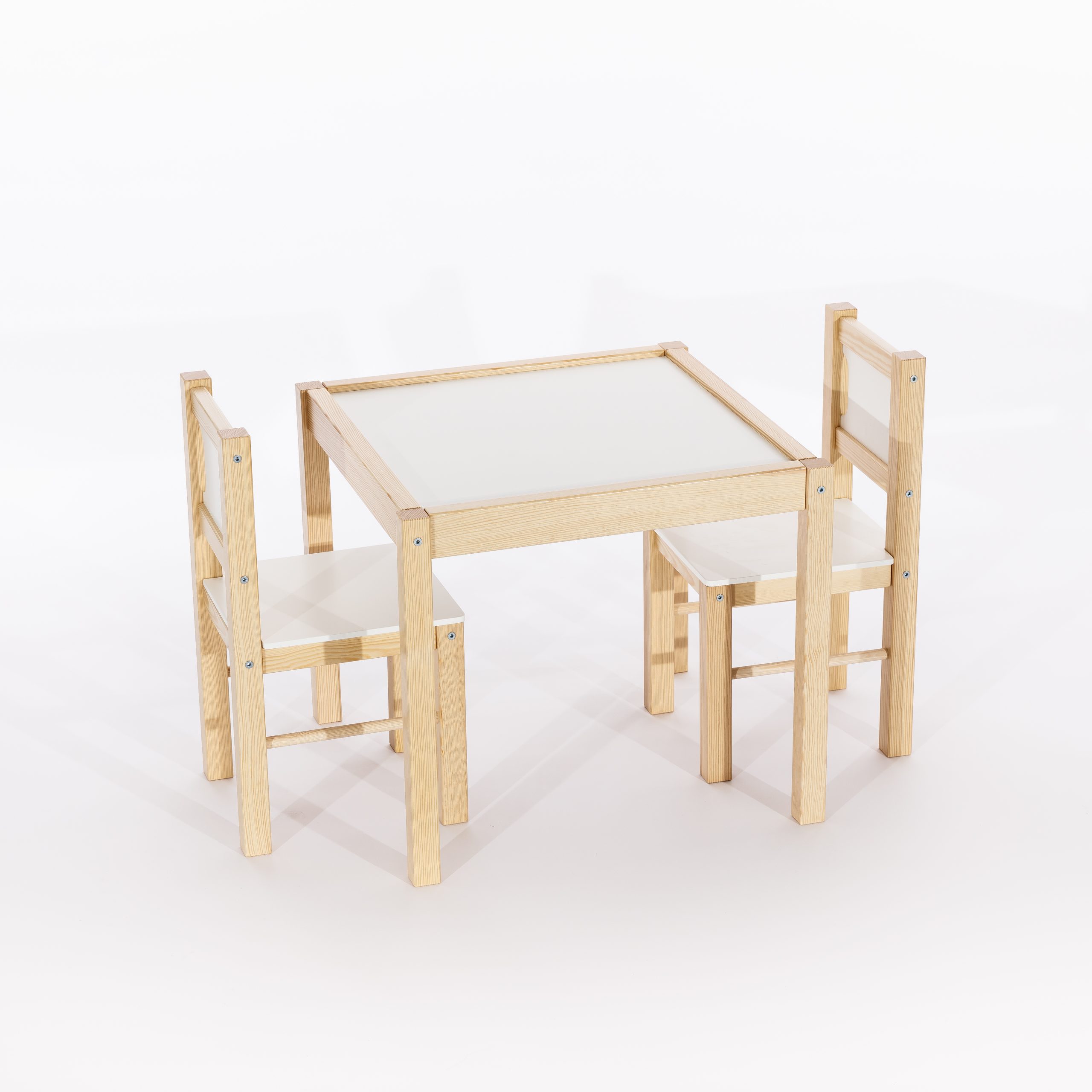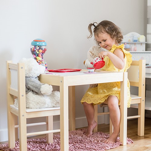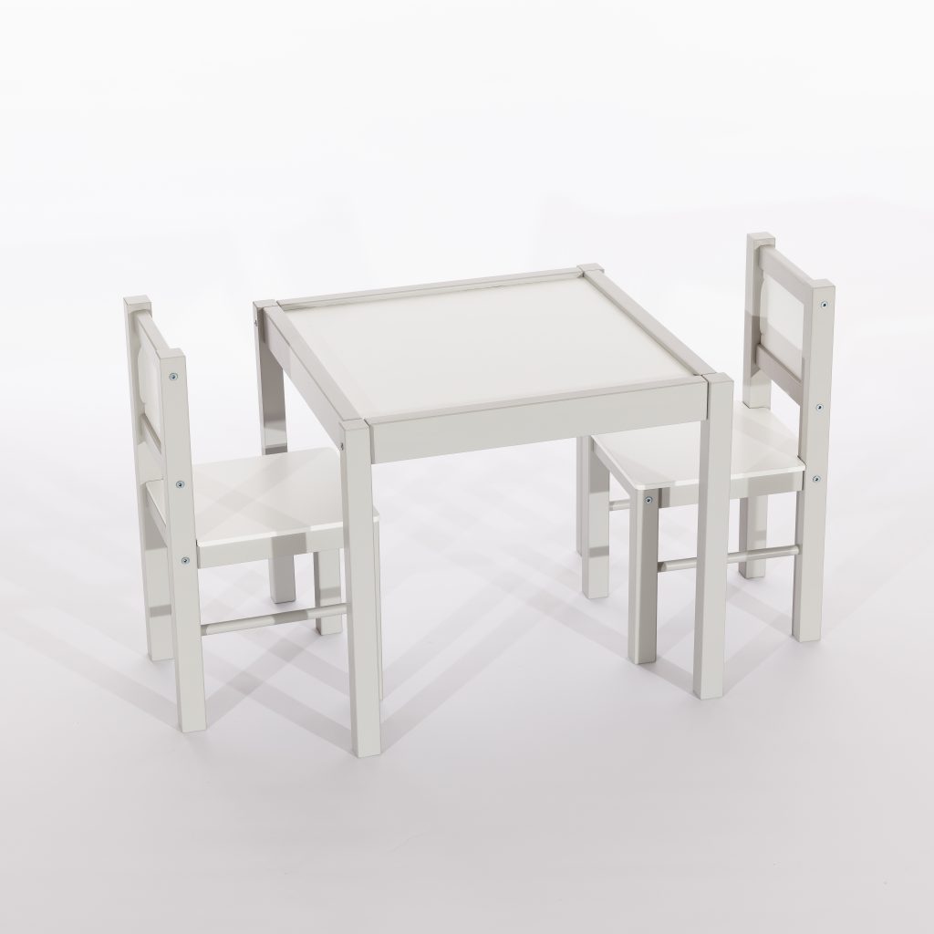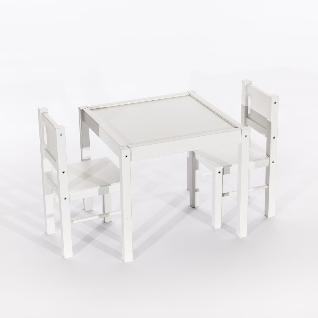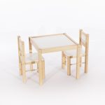 Zestaw Mebelków stolik i 2 krzesła został w całości wyprodukowany w Polsce. Solidna drewniana konstrukcja uzupełniona elementami z płyty wiórowej zapewnia trwałość na lata. Sam projekt został przemyślany tak, by idealnie wpasować się w każde wnętrze.